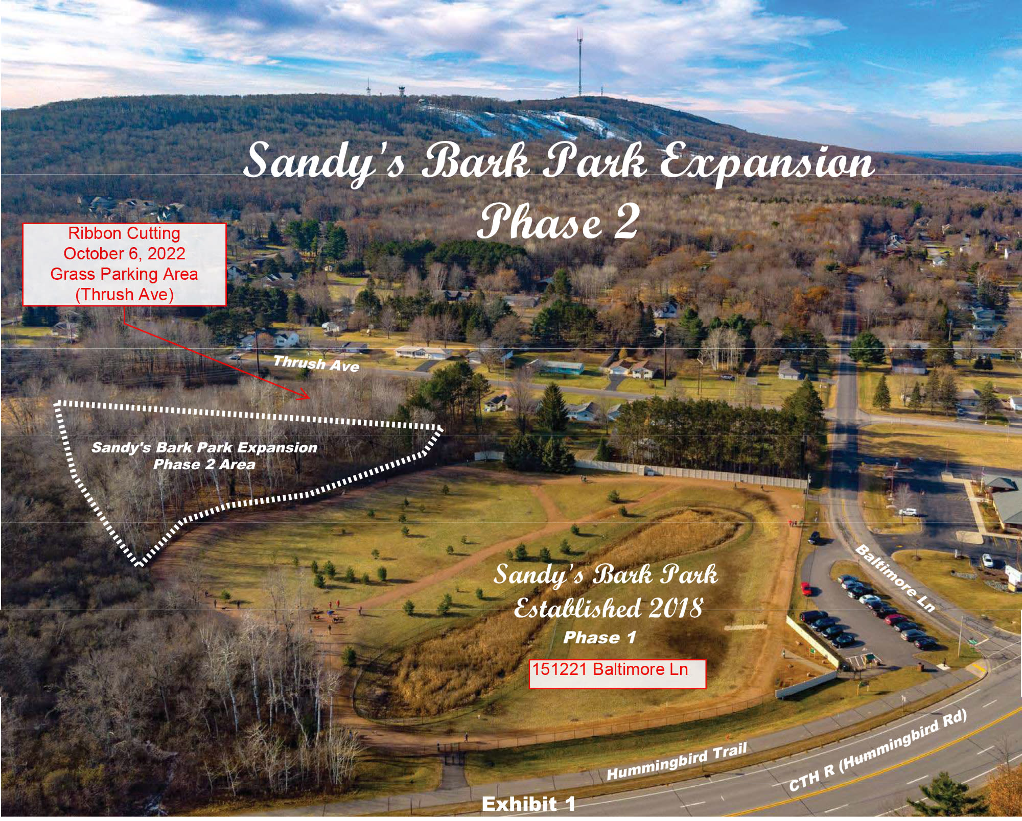 Directions: Attached is a map for the location of the dog park expansion – off of Thrush Ln (the existing dog park is located at 151221 Baltimore Ln)